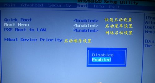 4、Boot(引导设置)。我们设置第一启动项就是在这个选项下进行的。如果要使用快捷键直接实现一键U盘启动则需要将“快速启动”的选项开启。如图所示: